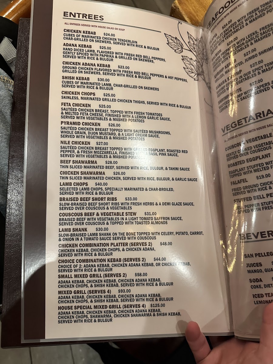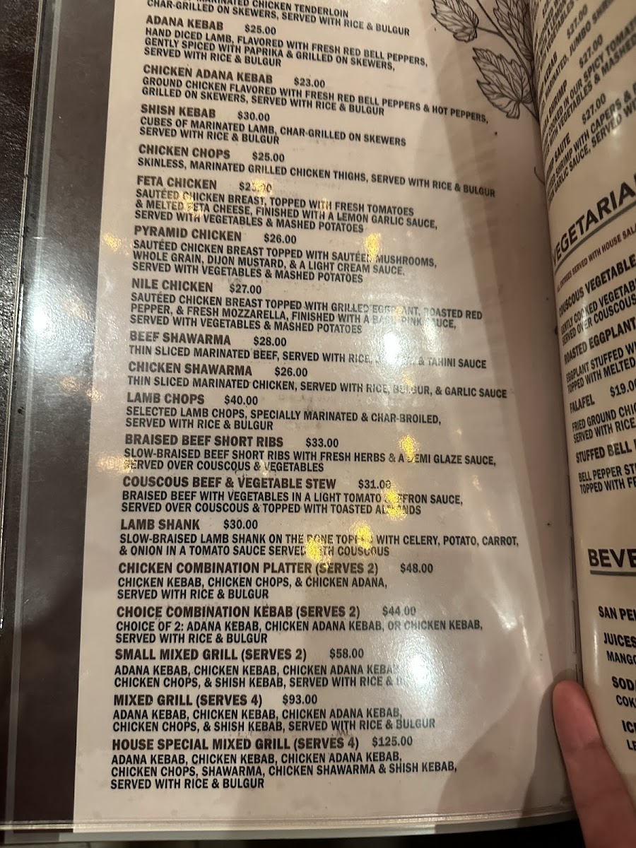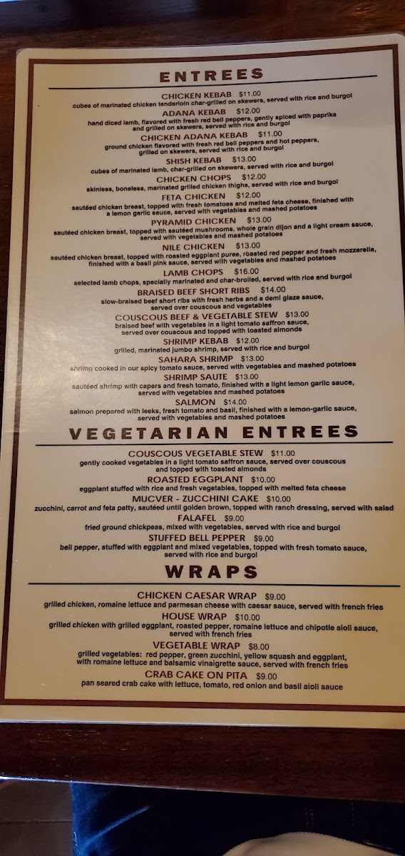 When it comes to seafood, the menu proudly features the Tilapia, a simple yet delicious option for seafood lovers, offering a light, flavorful entree. The restaurant also offers a variety of hearty entrees, including the flavorful Chicken Chops, tender Adana Kebab, and the juicy Pyramid Chicken Shish Kebab, all cooked to perfection. The Feta Chicken is another standout, blending the tanginess of feta with succulent chicken for a truly satisfying dish.