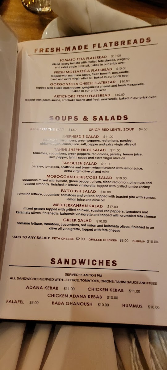 To complement your meal, the restaurant offers a selection of fresh salads, including the refreshing Greek Salad and the Tahini Shepherd's Salad, which is perfect for those seeking something light yet fulfilling. For soup lovers, the Soup of the Day provides a warm and comforting option that pairs well with any dish.