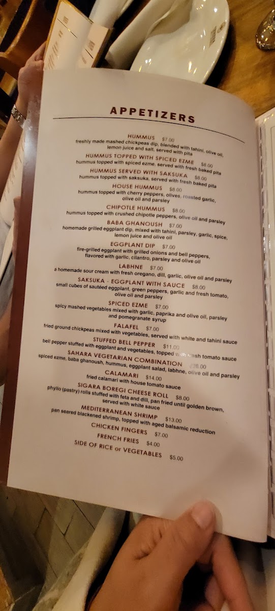 Overall, Sahara Restaurant provides a diverse and well-rounded menu that offers a little something for everyone, whether you're in the mood for a light appetizer or a full-course meal. With its blend of Mediterranean and Middle Eastern flavors, it's a spot worth visiting for both locals and visitors alike.